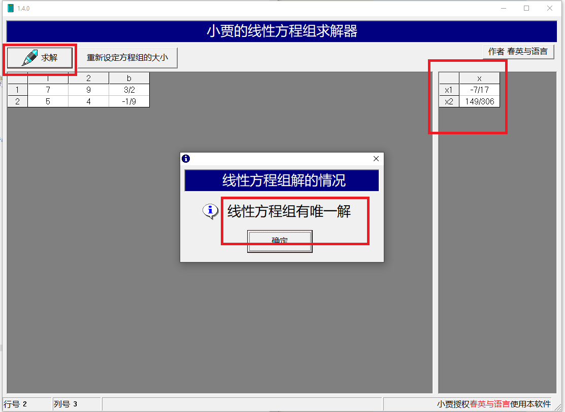 算例一中的线性方程组由两个方程,两个未知数组成。通过小贾线性方程组求解器的求解, 我们获得了该方程组解的情况。 所获得的解以分数形式显示,是该方程组的准确解。 详情请操作参考PDF: